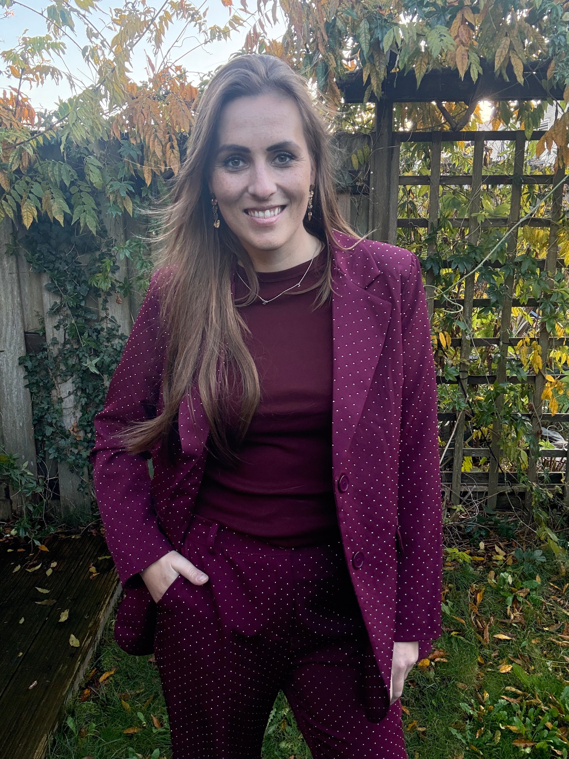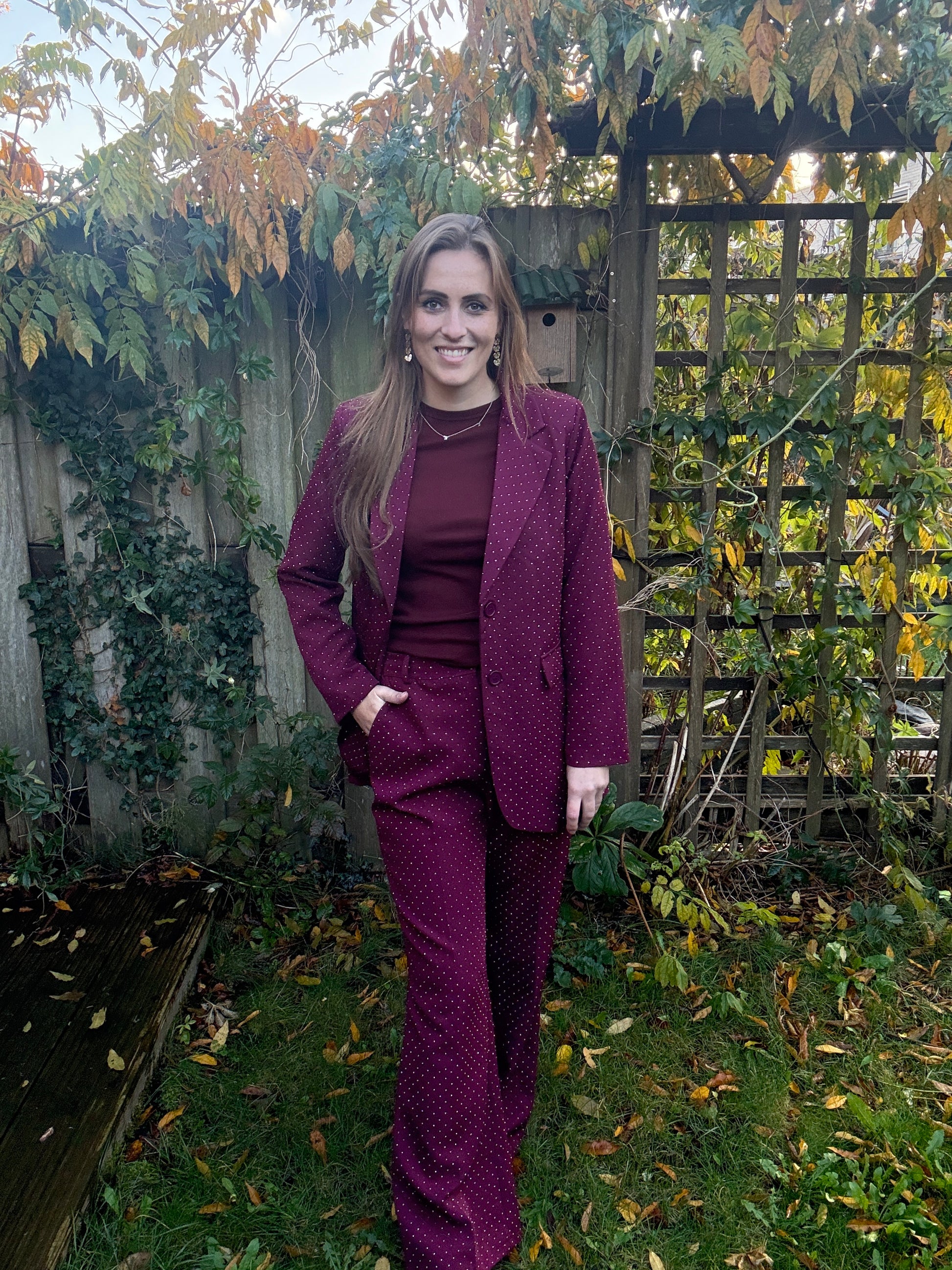 Feestelijk rode colbert met glitter steentjes, perfect voor kerst, feestjes of een speciale gelegenheid.