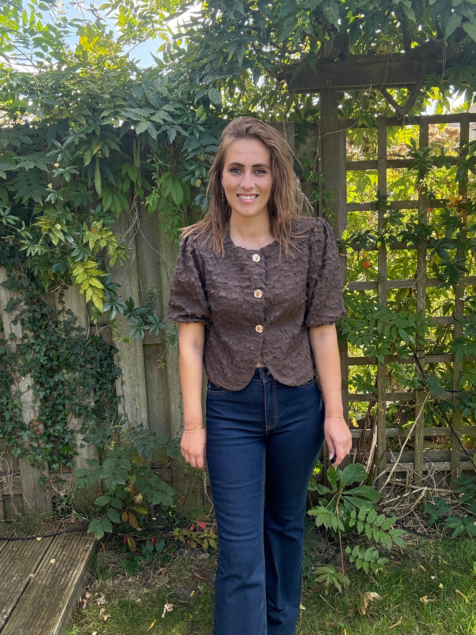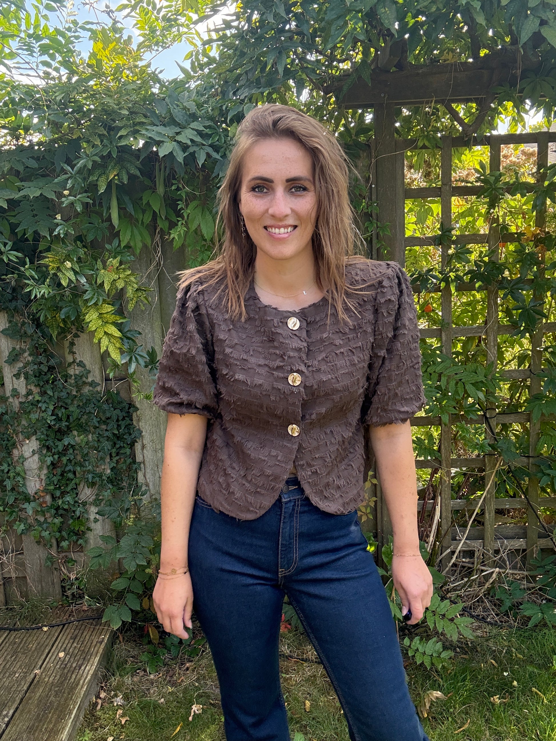 Het jasje is wat korter model, ideaal voor boven een high waist jeans.