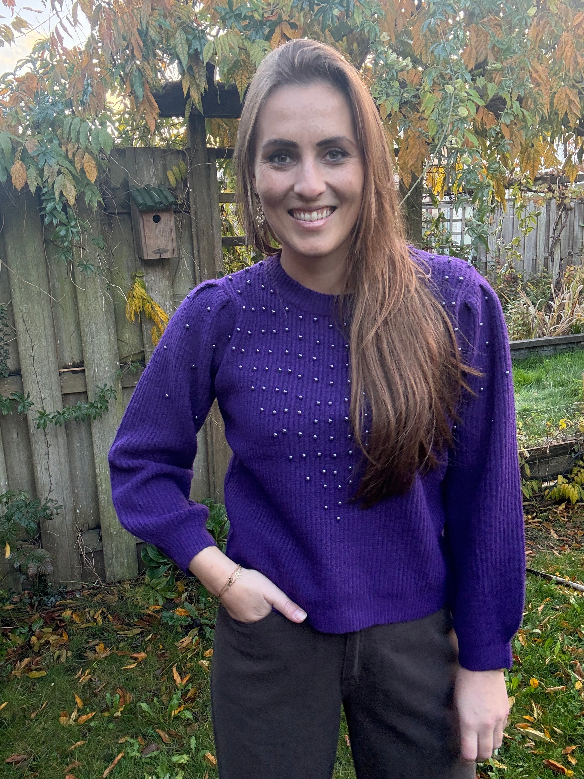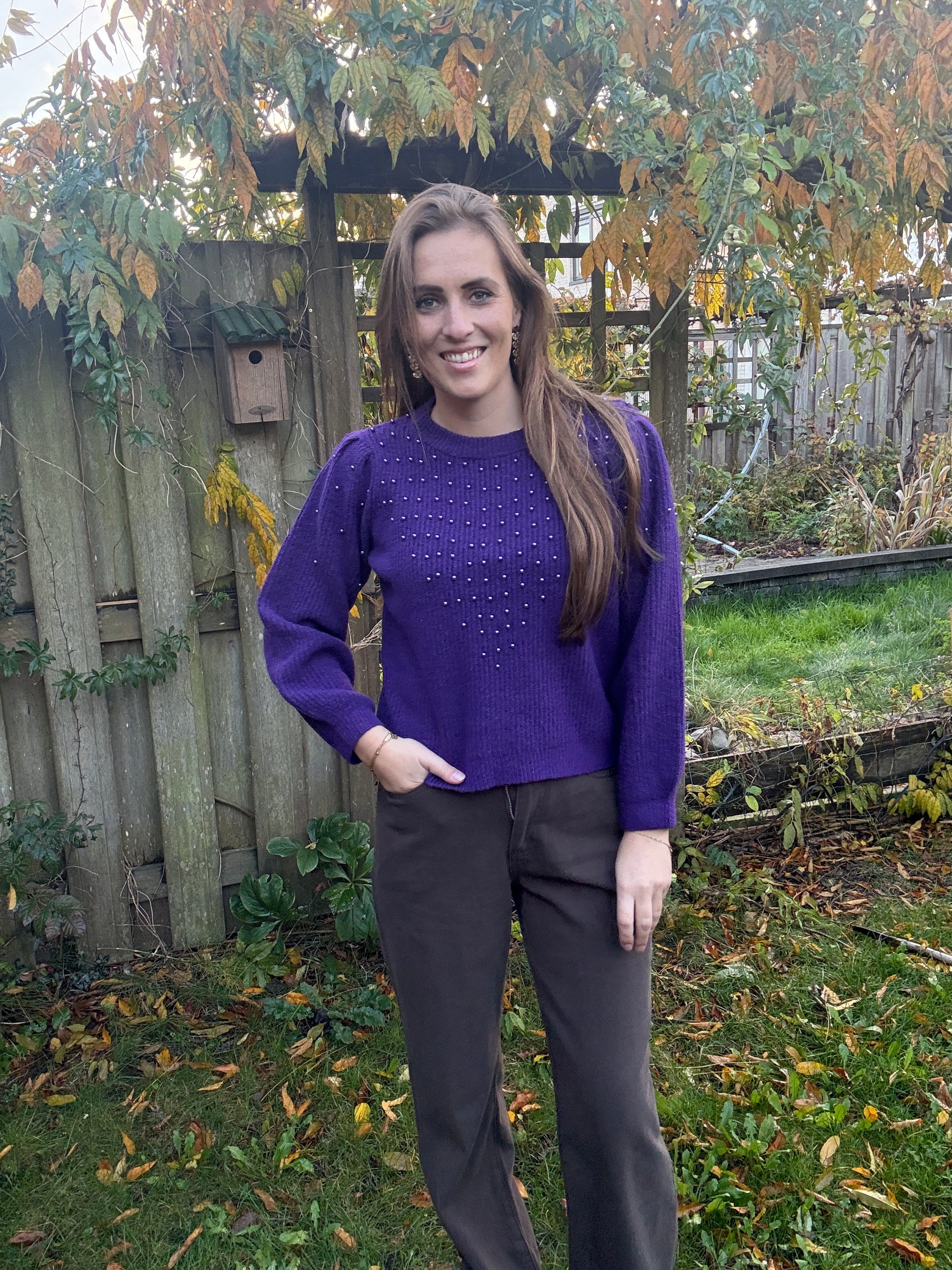 Stijlvolle trui van Azzurro met prachtige pareltjes op de voorkant in dezelfde kleur als de stof. Verkrijgbaar in paars, zoals op de foto, maar ook in het wit en rood