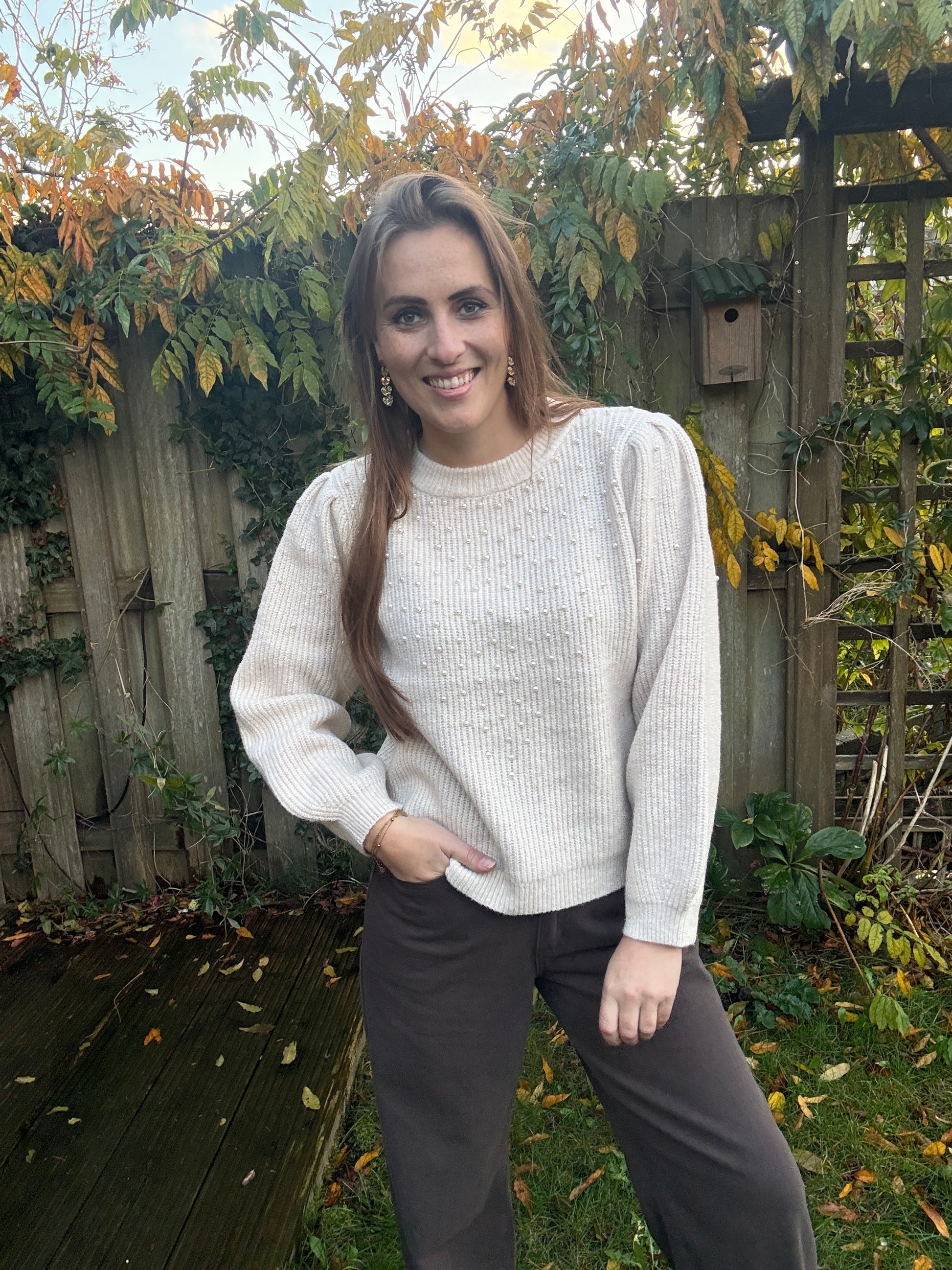 Stijlvolle trui van Azzurro met prachtige pareltjes op de voorkant in dezelfde kleur als de stof. Verkrijgbaar in wit zoals op de foto, maar ook in het paars en bordeaux rood